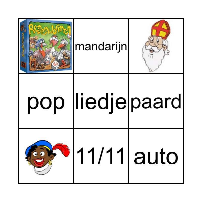 This bingo card has 3 images, a free space and 5 words: paard, mandarijn, auto, pop and 11/11.