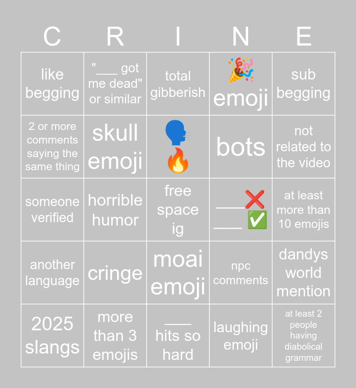 This bingo card has a free space and 24 words: cringe, more than 3 emojis, 🗣️🔥, 2025 slangs, sub begging, like begging, 2 or more comments saying the same thing, "___ got me dead" or similar, ___❌ ___ ✅, moai emoji, bots, someone verified, npc comments, dandys world mention, skull emoji, laughing emoji, at least more than 10 emojis, total gibberish, not related to the video, horrible humor, at least 2 people having diabolical grammar, another language, 🎉 emoji and ___ hits so hard.