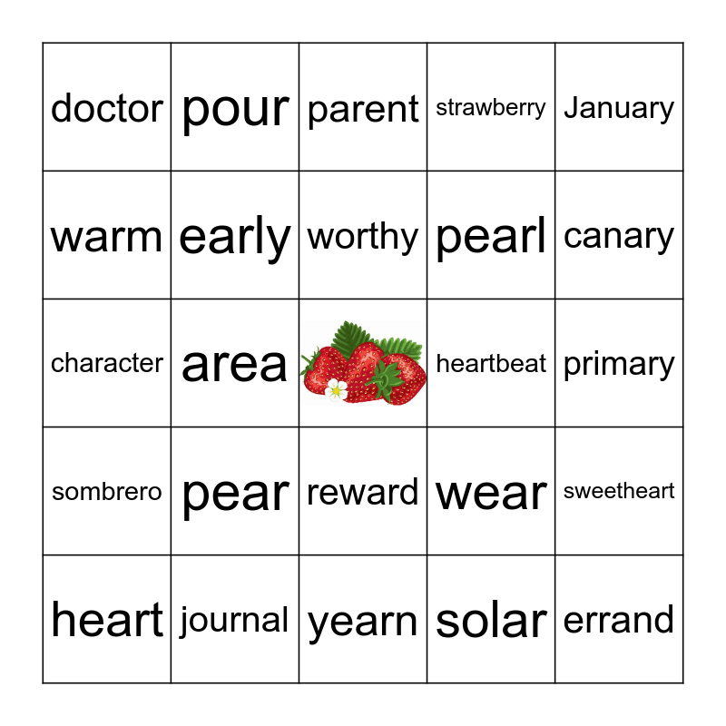 This bingo card has a free space and 24 words: pear, journal, worthy, heart, January, doctor, warm, pour, heartbeat, reward, pearl, character, wear, sweetheart, early, solar, primary, parent, canary, area, errand, sombrero, strawberry and yearn.