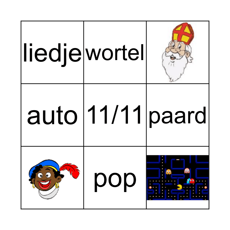 This bingo card has 3 images, a free space and 5 words: paard, wortel, liedje, auto and pop.
