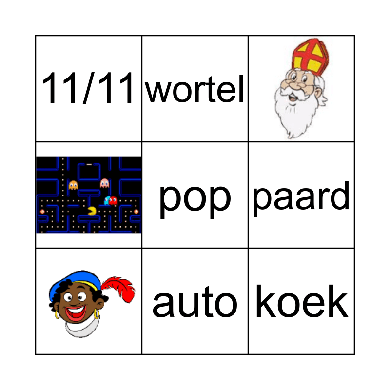 This bingo card has 3 images, a free space and 5 words: paard, wortel, 11/11, koek and auto.