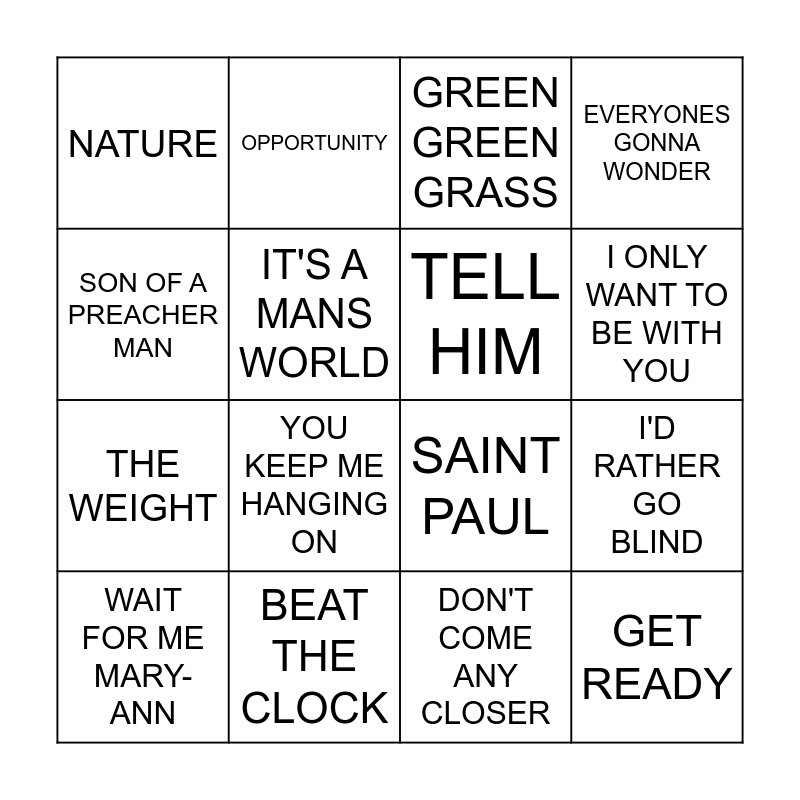 This bingo card has 26 words: DREAM A LITTLE DREAM OF ME, I CAN'T HELO MYSELF, I ONLY WANT TO BE WITH YOU, YOU'VE LOST THAT LOVING FEELING, SON OF A PREACHER MAN, NATURE, IT'S A MANS WORLD, OPPORTUNITY, DON'T COME ANY CLOSER, A SUNDAY KIND OF LOVE, THE WEIGHT, SAINT PAUL, THAT'LL BE THE DAY, TIMOTHY, I'D RATHER GO BLIND, YOU DON'T OWN ME, EVERYONES GONNA WONDER, GET READY, GREEN GREEN GRASS, WAIT FOR ME MARY-ANN, YOU KEEP ME HANGING ON, THROUGH THE GRAPEVINE, BEAT THE CLOCK, RUN AROUND SUE, TELL HIM and SOMEDAY WE'LL BE TOGETHER.