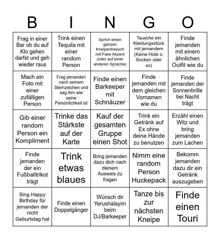 This bingo card has a free space and 24 words: Trink etwas blaues, Finde einen Doppelgänger, Finde einen Barkeeper mit Schnäuzer, Sing Happy Birthday für jemanden der nicht Geburtstag hat, Finde jemanden mit einem ähnlichen Outfit wie du, Frag in einer Bar ob du auf Klo gehen darfst und geh wieder raus, Mach ein Foto mit einer zufälligen Person, Trink einen Tequila mit einer random Person, Trink ein Getränk auf Ex ohne deine Hände zu benutzen, Bring jemanden dazu dich nach deinem Ausweis zu fragen, Finde jemanden mit dem gleichen Vornamen wie du, Gib einer random Person ein Kompliment, Nimm eine random Person Huckepack, Bekomm jemanden dazu dir ein Getränk auszugeben, Frag jemanden nach seinem Sternzeichen und sag ihm wie seine Persönlichkeit ist, Tanze bis zur nächsten Kneipe, Erzähl einen Witz und bring jemanden zum Lachen, Sprich einen ganzen Kneipenbesuch mit Fake Akzent (oder auf einer anderen Sprache), Finde jemanden der Sonnenbrille bei Nacht trägt, Trinke das Stärkste auf der Karte, Finde einen Touri, Finde jemanden der ein Fußballtrikot trägt, Tausche ein Kleidungsstück mit jemandem (Keine Hüte o. Socken oder so) and Wünsch dir Yerushalayim beim DJ/Barkeeper.