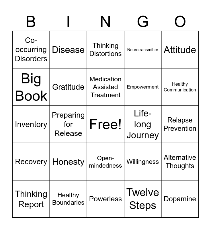 This bingo card has a free space and 34 words: Coping Skills, Twelve Steps, AA, NA, Recovery, Gratitude, Attitude, Thinking Report, Disease, Substance Use Disorder, Medication Assisted Treatment, Thinking Distortions, Higher Power, Integrity, Life-long Journey, Healthy Communication, Healthy Boundaries, Inventory, Honesty, Willingness, Open-mindedness, Resentment, Co-occurring Disorders, Relapse Prevention, Powerless, Dopamine, Neurotransmitter, Respect, Empowerment, Big Book, SAP, Preparing for Release, Alternative Thoughts and Alternative Behaviors.