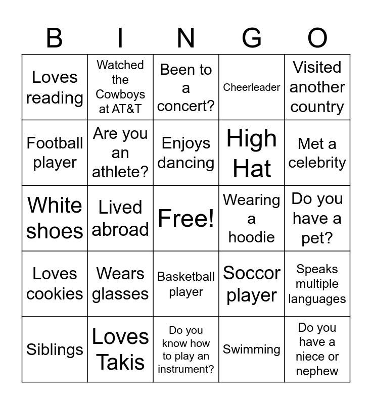 This bingo card has a free space and 24 words: Wears glasses, Loves Takis, Enjoys dancing, Siblings, Visited another country, Loves reading, Football player, Watched the Cowboys at AT&T, Wearing a hoodie, Basketball player, High Hat, White shoes, Soccor player, Speaks multiple languages, Are you an athlete?, Swimming, Do you have a pet?, Been to a concert?, Met a celebrity, Lived abroad, Do you have a niece or nephew, Loves cookies, Cheerleader and Do you know how to play an instrument?.