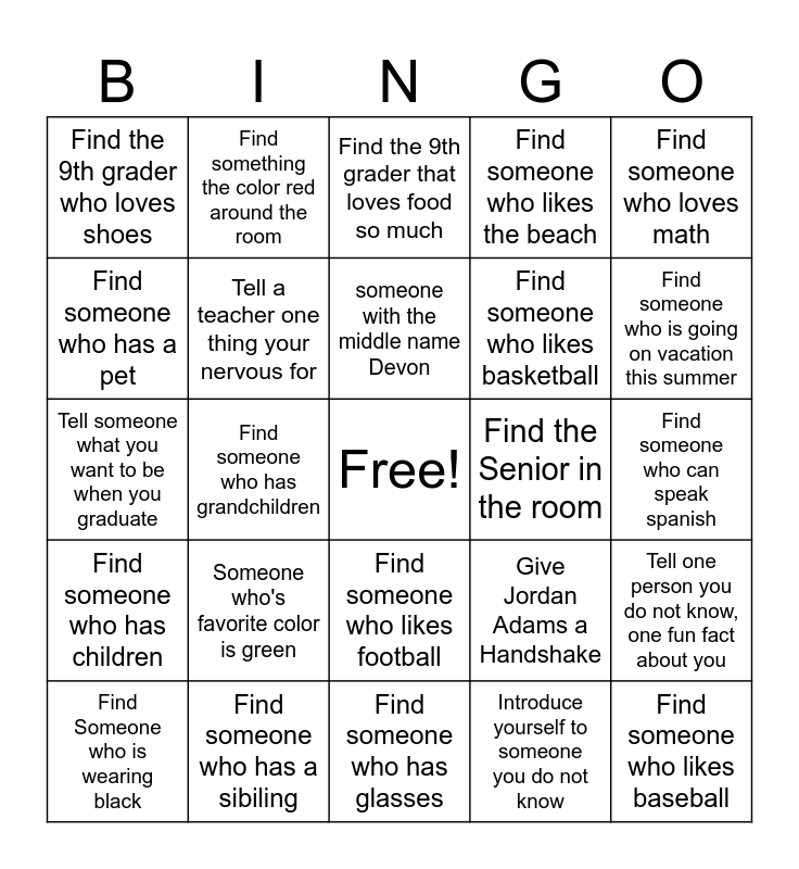 This bingo card has a free space and 24 words: Find Someone who is wearing black, Someone who's favorite color is green, someone with the middle name Devon, Introduce yourself to someone you do not know, Find someone who loves math, Find the 9th grader who loves shoes, Find something the color red around the room, Find the 9th grader that loves food so much, Find the Senior in the room, Find someone who can speak spanish, Tell someone what you want to be when you graduate, Tell a teacher one thing your nervous for, Give Jordan Adams a Handshake, Tell one person you do not know, one fun fact about you, Find someone who has a pet, Find someone who has a sibiling, Find someone who has glasses, Find someone who likes the beach, Find someone who is going on vacation this summer, Find someone who has children, Find someone who has grandchildren, Find someone who likes football, Find someone who likes basketball and Find someone who likes baseball.