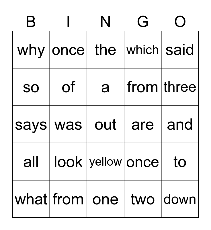 This bingo card has a free space and 29 words: what, where, was, when, why, the, of, look, are, from, and, down, one, two, three, blue, yellow, all, said, says, once, word, from, so, which, once, to, a and is.