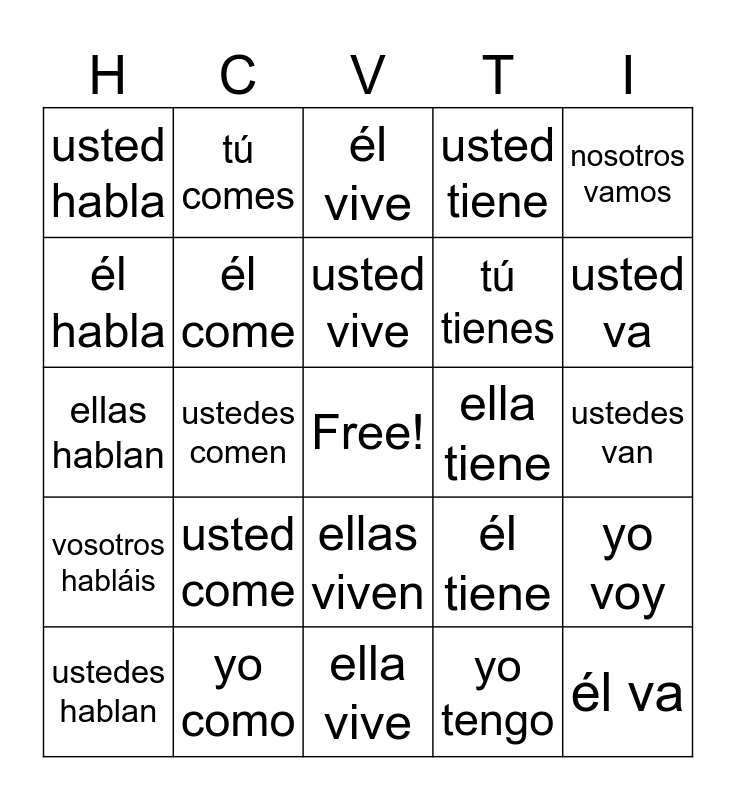 This bingo card has a free space and 50 words: yo hablo, yo como, yo vivo, yo tengo, yo voy, tú hablas, tú comes, tú vives, tú tienes, tú vas, él habla, él come, él tiene, él va, ella habla, ella come, él vive, ella tiene, ella va, usted habla, usted come, ella vive, usted tiene, usted va, nosotros hablamos, nosotros comemos, usted vive, nosotros tenemos, nosotros vamos, vosotros habláis, vosotros coméis, nosotros vivimos, vosotros tenéis, vosotros váis, ellos hablan, ellos comen, vosotros vivís, ellos tienen, ellos van, ellas hablan, ellas comen, ellos viven, ellas tienen, ellas van, ustedes hablan, ustedes comen, ellas viven, ustedes tienen, ustedes van and ustedes viven.