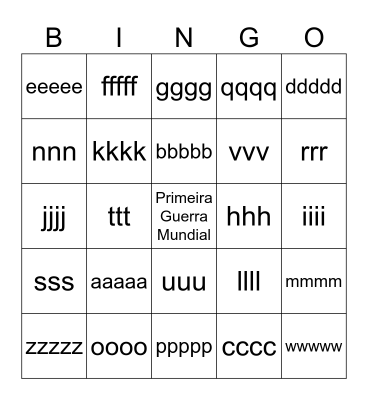 This bingo card has a free space and 24 words: zzzzz, aaaaa, bbbbb, cccc, ddddd, eeeee, fffff, gggg, hhh, iiii, jjjj, kkkk, llll, mmmm, nnn, oooo, ppppp, qqqq, rrr, sss, ttt, uuu, vvv and wwwww.