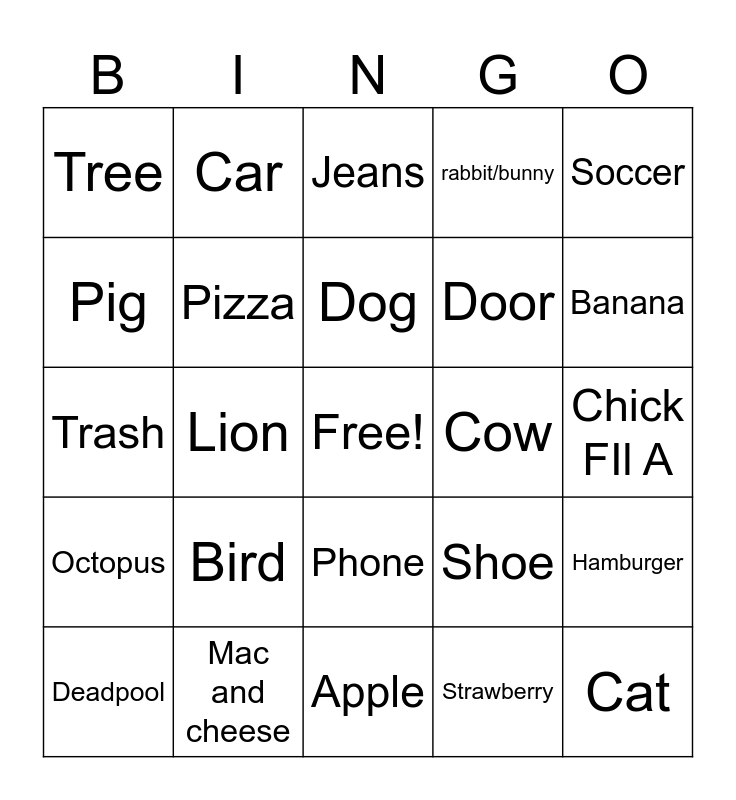 This bingo card has a free space and 50 words: Flower, Cat, Chiefs, Apple, Bird, Panda, Car, Takis, Pig, Pencil, Pizza, rabbit/bunny, Hamburger, Shoe, Stitch, Basketball, Dog, Cow, Football, Soccer, Lion, Strawberry, Tree, Door, School, House, Banana, Shirt, Jeans, Phone, Computer, Table, Window, Mexican restaurant, Mac and cheese, Crumble cookies, Starbucks, Crocs, McDonalds, Chick FIl A, Mexican Flag, Nike, Real Madrid, Tito Double P, Deadpool, Trash, Watch, Snake, Octopus and Rain.
