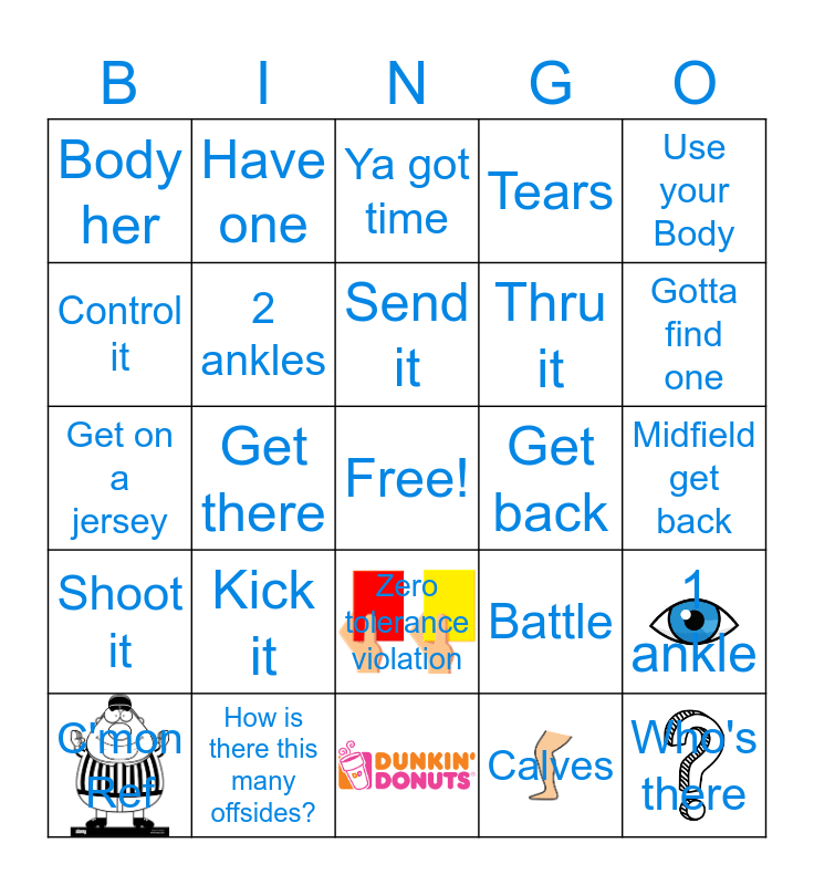 This bingo card has 6 images, a free space and 23 words: Kick it, How is there this many offsides?, Send it, C'mon Ref, Use your Body, Body her, Control it, Have one, Get back, Zero tolerance violation, Thru it, Get on a jersey, Battle, 1 ankle, 2 ankles, Calves, Midfield get back, Ya got time, Gotta find one, Get there, Who's there, Shoot it and Tears.