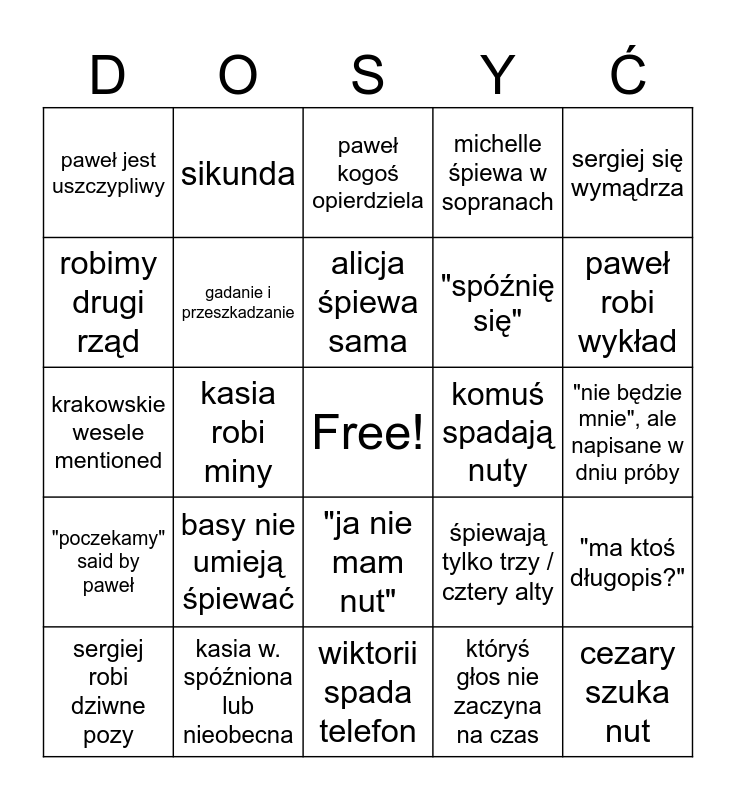 This bingo card has a free space and 24 words: basy nie umieją śpiewać, kasia w. spóźniona lub nieobecna, alicja śpiewa sama, sergiej robi dziwne pozy, sergiej się wymądrza, paweł jest uszczypliwy, robimy drugi rząd, sikunda, komuś spadają nuty, "ja nie mam nut", "spóźnię się", krakowskie wesele mentioned, śpiewają tylko trzy / cztery alty, "ma ktoś długopis?", gadanie i przeszkadzanie, któryś głos nie zaczyna na czas, "nie będzie mnie", ale napisane w dniu próby, paweł kogoś opierdziela, paweł robi wykład, kasia robi miny, cezary szuka nut, "poczekamy" said by paweł, michelle śpiewa w sopranach and wiktorii spada telefon.