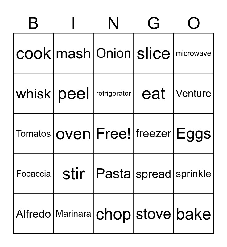 This bingo card has a free space and 49 words: boil, bake, cut, chop, stir, grate, mash, mix, whisk, pour, peel, slice, sprinkle, spread, squeeze, cabinet, refrigerator, freezer, fry, microwave, oven, stove, cook, eat, Mise en place, Venture, Alfredo, Donuts, Pasta, Focaccia, Rice Krispies, Pickles, Cookies, Chicken Noodle Soup, Marinara, Herbs, Spices, Intensives, Eggs, Butter, Flour, Cheese, Clean, Stations, Tomatos, Onion, Dice, Basil and Chocolate Chips.