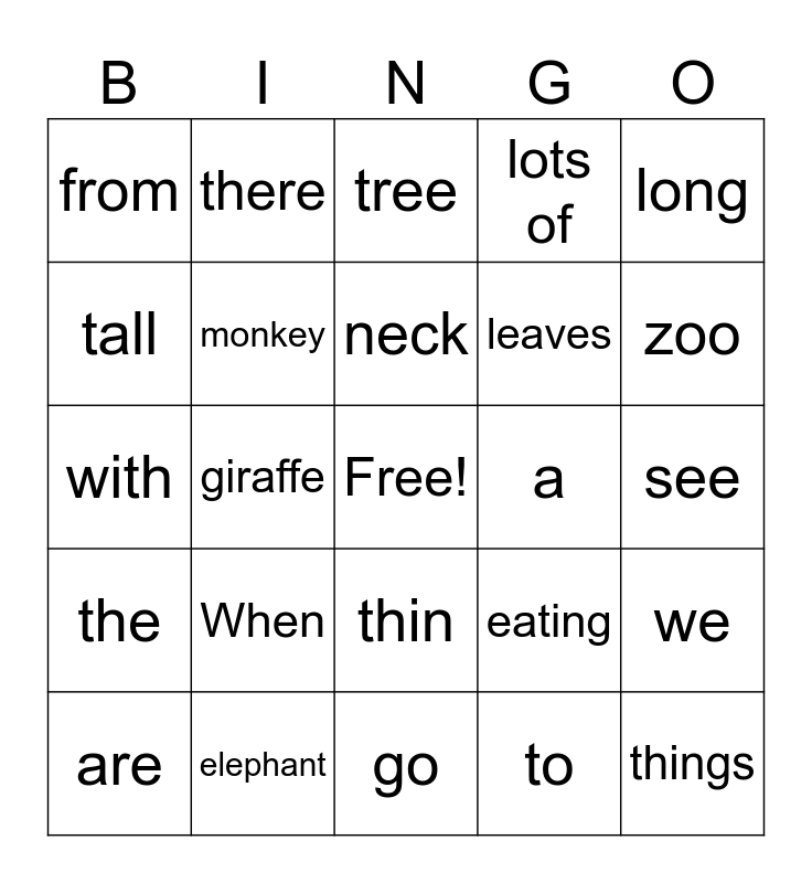 This bingo card has a free space and 24 words: When, elephant, neck, are, long, from, tall, there, a, thin, leaves, with, eating, we, monkey, to, see, tree, zoo, giraffe, things, the, lots of and go.