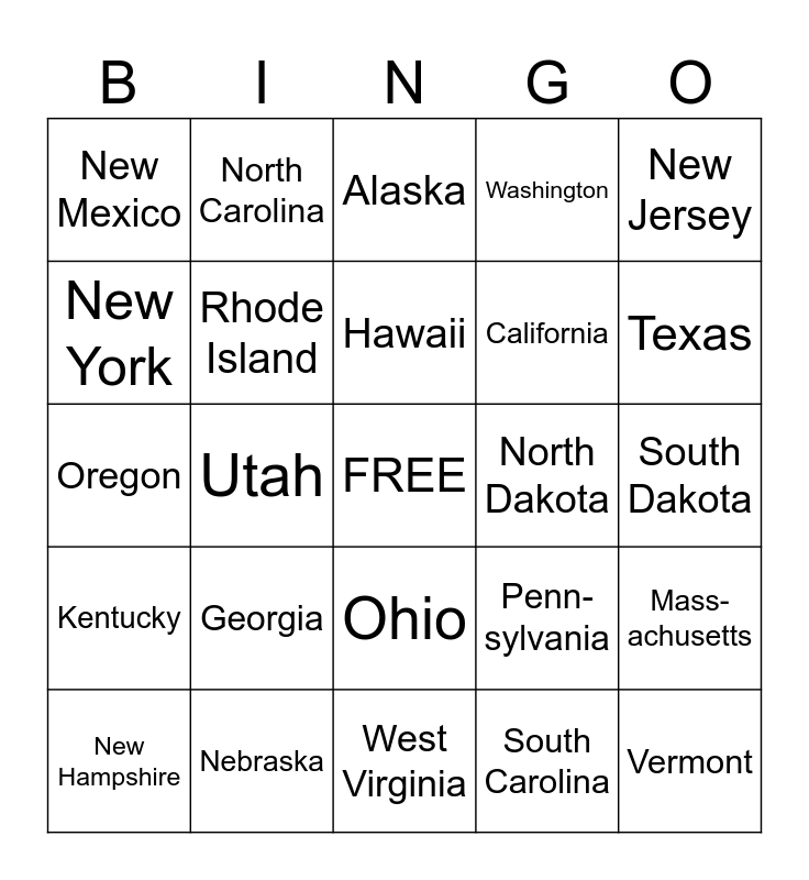 This bingo card has a free space and 24 words: Georgia, Nebraska, Hawaii, New Hampshire, New Jersey, New Mexico, New York, North Carolina, North Dakota, Ohio, California, Oregon, Penn- sylvania, Mass- achusetts, Rhode Island, South Carolina, South Dakota, Alaska, Texas, Utah, Vermont, Kentucky, Washington and West Virginia.