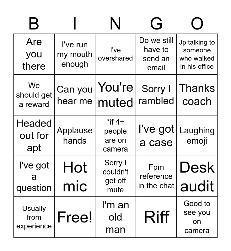 This bingo card has 28 words: Desk audit, Gs12, Sorry I rambled, Riff, We should get a reward, I've overshared, I've run my mouth enough, I've got a question, I've got a case, Usually from experience, Headed out for apt, Do we still have to send an email, Free!, I'm an old man, Thanks coach, Can I just say, Hot mic, Can you hear me, You're muted, Sorry I couldn't get off mute, Are you there, Good to see you on camera, *if 4+ people are on camera, Applause hands, Laughing emoji, Fpm reference in the chat, Jp talking to someone who walked in his office and A joke from Macri.