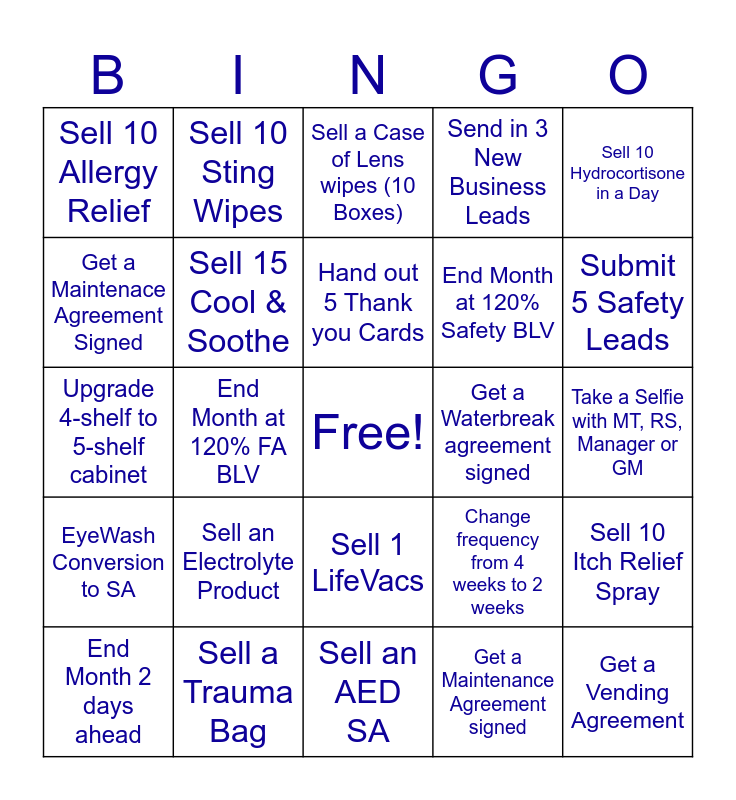 This bingo card has a free space and 24 words: Sell an Electrolyte Product, Sell a Trauma Bag, Hand out 5 Thank you Cards, End Month 2 days ahead, Sell 10 Hydrocortisone in a Day, Sell 10 Allergy Relief, Get a Maintenace Agreement Signed, Sell 10 Sting Wipes, Get a Waterbreak agreement signed, Sell 1 LifeVacs, End Month at 120% Safety BLV, Upgrade 4-shelf to 5-shelf cabinet, Change frequency from 4 weeks to 2 weeks, Sell 10 Itch Relief Spray, Sell 15 Cool & Soothe, Get a Maintenance Agreement signed, Take a Selfie with MT, RS, Manager or GM, Sell a Case of Lens wipes (10 Boxes), Submit 5 Safety Leads, End Month at 120% FA BLV, Get a Vending Agreement, EyeWash Conversion to SA, Send in 3 New Business Leads and Sell an AED SA.