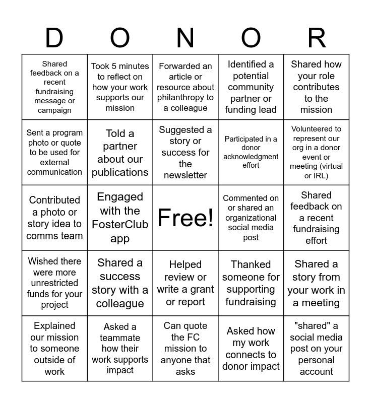This bingo card has a free space and 24 words: Shared a success story with a colleague, Asked a teammate how their work supports impact, Suggested a story or success for the newsletter, Explained our mission to someone outside of work, Shared how your role contributes to the mission, Shared feedback on a recent fundraising message or campaign, Sent a program photo or quote to be used for external communication, Took 5 minutes to reflect on how your work supports our mission, Commented on or shared an organizational social media post, Helped review or write a grant or report, Participated in a donor acknowledgment effort, Contributed a photo or story idea to comms team, Thanked someone for supporting fundraising, Shared a story from your work in a meeting, Told a partner about our publications, Asked how my work connects to donor impact, Shared feedback on a recent fundraising effort, Forwarded an article or resource about philanthropy to a colleague, Volunteered to represent our org in a donor event or meeting (virtual or IRL), Engaged with the FosterClub app, "shared" a social media post on your personal account, Wished there were more unrestricted funds for your project, Identified a potential community partner or funding lead and Can quote the FC mission to anyone that asks.