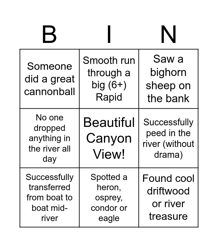 This bingo card has a free space and 15 words: Hit the tongue perfectly, Boat stayed dry in a splashy rapid, Saw a bighorn sheep on the bank, Someone did a great cannonball, Spotted a heron, osprey, condor or eagle, Found cool driftwood or river treasure, Got a cheer for running a rapid well, Surfed a wave (on purpose!), Successfully peed in the river (without drama), Heard your own echo, mid-river costume change, No one dropped anything in the river all day, Successfully transferred from boat to boat mid-river, Smooth run through a big (6+) Rapid and Sashay through the Rock Garden.