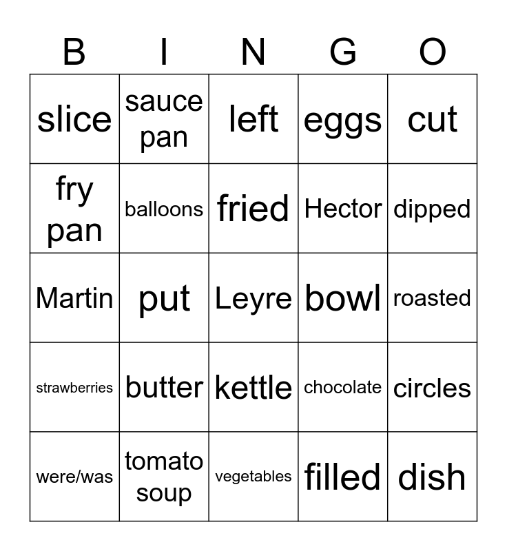 This bingo card has a free space and 24 words: butter, tomato soup, fried, were/was, cut, slice, fry pan, sauce pan, bowl, kettle, Hector, Martin, chocolate, circles, balloons, filled, roasted, left, dipped, put, dish, strawberries, eggs and vegetables.
