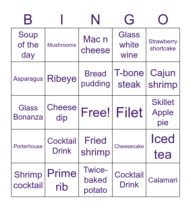 This bingo card has a free space and 29 words: Crab cake app, Prime rib, Mac n cheese, Bottle red wine, Strawberry shortcake, Soup of the day, Ribeye, Bread pudding, Filet, Iced tea, Shrimp cocktail, Cheese dip, Cocktail Drink, Calamari, Glass Bonanza, Chili pepper steak special, Twice- baked potato, Cheesecake, Cajun shrimp, Porterhouse, Cocktail Drink, Glass white wine, T-bone steak, Skillet Apple pie, Asparagus, Mushrooms, Fried shrimp, Glass white wine and Crab cake entree.