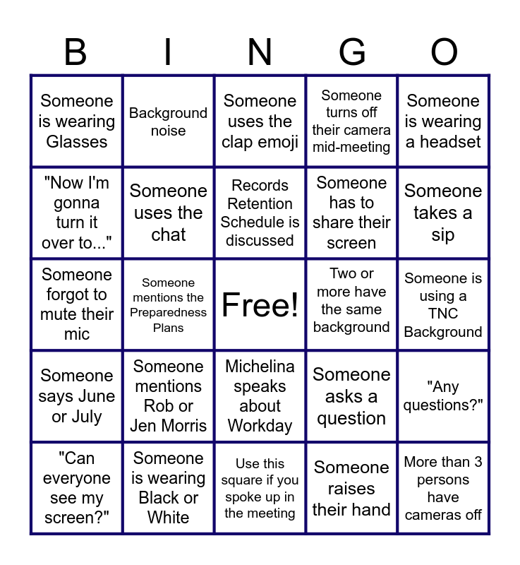 This bingo card has a free space and 29 words: "Can everyone see my screen?", Someone is late to the meeting, Someone mentions the Preparedness Plans, Someone speaks on the Workday Timeline, Someone is wearing Glasses, Someone uses the clap emoji, Someone uses the chat, Someone mentions Rob or Jen Morris, Two or more have the same background, Someone is wearing Black or White, Someone is using a TNC Background, More than 3 persons have cameras off, Use this square if you spoke up in the meeting, Someone raises their hand, Someone takes a sip, More than 3 persons have cameras on, Michelina speaks about Workday, Someone says June or July, Someone is wearing a headset, Someone forgot to mute their mic, Someone asks a question, Someone mentions Conservation Training.org, Someone has to share their screen, "Now I'm gonna turn it over to...", Someone turns off their camera mid-meeting, Background noise, "Any questions?", Records Retention Schedule is discussed and Someone mentions the Hurricane Season.
