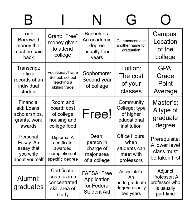 This bingo card has a free space and 45 words: ACT/SAT: A college entrance test, Adjunct Professor: A professor who is usually part-time, Advisor: assists and advises students on academic matters, Alumni: graduates, Application: A written request admission to a college, Associate’s: An undergraduate degree usually two years, Bachelor’s: An academic degree usually four years, Board of Trustees: Governing body of the college., Campus: Location of the college, Certificate: courses in a concentrated skill area of study, Commencement: another name for graduation, Community College: type of higher educational institution, Dean: person in charge of major area of a college, Diploma: A certificate awarded completion of specific degree, Dorms: A housing option on a college campus, FAFSA: Free Application for Federal Student Aid, Fees: Additional costs for taking college courses, Financial aid: Loans, scholarships, grants, work awards, Freshmen: First year of college, GPA: Grade Point Average, Grant: “Free” money given to attend college, Junior: Third year of college, Lectures: An oral presentation from professor, Loan: Borrowed money that must be paid back, Major: A field of study chosen by a college student, Master’s: A type of graduate degree, Minor: A secondary course of study in college, NCAA: Governing body for collegiate athletics, Office Hours: when students can meet with professors, Personal Essay: An essay that you write about yourself, Ph.D.: Doctorate Degree, Prerequisite: A lower level class must be taken first, Professor: college teacher, Register: To sign up for specific college courses, Residence Halls: college dorms/dormitories, Room and board: cost of college housing and college food, Scholarship: Money being given to students to pay for college, Semesters: A college year divided by fall, spring, summer terms, Senior: Final or fourth year of college, Sophomore: Second year of college, Transcript: official records of an individual student, Tuition: The cost of your classes, Tutor: An expert one can go to for extra help, Vocational/Trade School: school teaching a skilled trade and Work Study: job at college through financial aid.