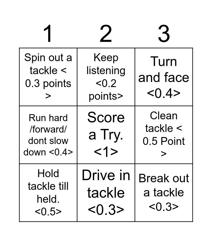 This bingo card has a free space and 8 words: Clean tackle < 0.5 Point >, Turn and face <0.4>, Keep listening <0.2 points>, Hold tackle till held. <0.5>, Spin out a tackle < 0.3 points >, Break out a tackle <0.3>, Run hard /forward/ dont slow down <0.4> and Drive in tackle <0.3>.