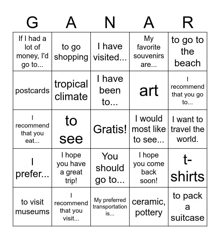 This bingo card has a free space and 33 words: I want..., to fly, to see, to visit, I prefer..., tropical climate, to go to the beach, to visit museums, to go shopping, to travel by plane, I have been to..., I have visited..., I would like to try..., I would like to visit..., I would most like to see..., I recommend that you go to..., I recommend that you visit..., I recommend that you eat..., I hope you have a great trip!, I hope you come back soon!, You should go to..., I will travel to..., If I had a lot of money, I'd go to..., I want to travel the world., My preferred transportation is..., to pack a suitcase, My favorite souvenirs are..., art, postcards, t-shirts, jewelry, ceramic, pottery and magnet.