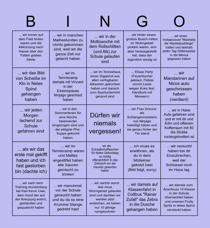 This bingo card has a free space and 24 words: ... wir im Tenniscamp waren und Mattes angestiftet haben alle Saucen gemischt zu trinken, .. wir manchmal vor der Schule geraucht haben und du da so eine Krumme Stange gedreht hast, ... wir im Tennishaus einen Gigashot aus allen verfügbaren Alksorten getrunken haben und danach zum Sportunterricht gerannt sind, ... wir nach dem Training stundenlang bei Karl Kevin Uwe, dem Hund der auf der Kreuzung wohnt, gestanden und gequatscht haben, ... wir einen Instaaccount "Mashalla die Wackelpuddinge" hatten und deshalb jeden Tag Götterspeise in der Mensa gegessen haben, ... wir immer auf dem Feld hinten waren und die Abkürzung nach Hause über den Fatten graben führte, ... wir das Bild von Scheiße im Klo in Neles Spind gehangen haben, ... wir in manchen Mathestunden zu nichts gekommen sind, weil wir die ganze Zeit nur gelacht haben, ... wir Frau Greune als Schlangenmeisterin von Ninjago beleidigt haben und sie genau hinter der Tür stand, ... wir die Extraalkoholflaschen für Neles Geburtstag so richtig offensichtlich in das Gebüsch vor der Haustür geworfen haben, ... Elisas Party (Feuerlöscher geklaut, Polizei nimmt Leute wegen Koks fest, Handtuch mit Messern), ... wir jeden Morgen lachend zur Schule gefahren sind, ... ich muss es erwähnen, als du in dem Mülleimer gekotzt hast (Bild folgt, sorry), ... wir versucht haben bei dir Einzubrechen, weil der Schlüssel noch im Haus lag, ... wir im Tenniscamp damals mit Vincent in der Essenspause Ninjago geschaut haben, ... wir damals auf Klassenfahrt in Cottbus "Rainer Zufall" das Zebra in die Dusche gehangen haben, ... wir in Hasis Auto gefahren sind und er mit dir und Edin und offenem Kofferraum mit 50 die Straße runtergebrettert ist, ... wir in der Mottowoche mit dem Rollschlitten (und Alk) zur Schule gelaufen sind, ... wir Mandarinen auf Nicos auto geschmissen haben (verdient), ... wir in den Sommerferien für eine Woche beieinander eingezogen sind und die ekligste Pho- Suppe gekocht haben, ... wir damals zum Abschluss 10 Klasse in der Schule übernachtet haben und unseren Fruity Spritz in deles Spind versteckt haben, ... als wir das erste mal gekifft haben und ich fast gestorben bin (dachte ich), ... wir hinter einem großen Busch mitten im Wohngebiet pinkeln waren, sich aber herausgestellt hat, dass der eigentlich winzig ist and ... wir nachts durch das neue Wohngebiet gelaufen sind und dachten wir werden jetzt erstochen, es haben nur 10 jährige rumgeschrien.