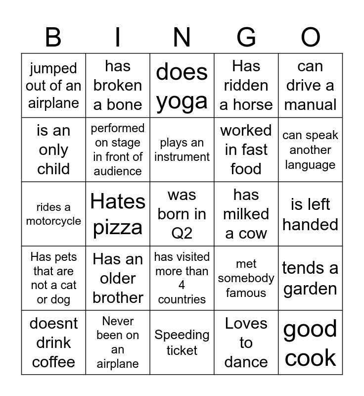 This bingo card has 25 words: Has an older brother, Speeding ticket, plays an instrument, doesnt drink coffee, can drive a manual, jumped out of an airplane, is an only child, has broken a bone, has milked a cow, has visited more than 4 countries, worked in fast food, rides a motorcycle, met somebody famous, tends a garden, performed on stage in front of audience, good cook, is left handed, does yoga, can speak another language, Hates pizza, was born in Q2, Never been on an airplane, Has pets that are not a cat or dog, Has ridden a horse and Loves to dance.