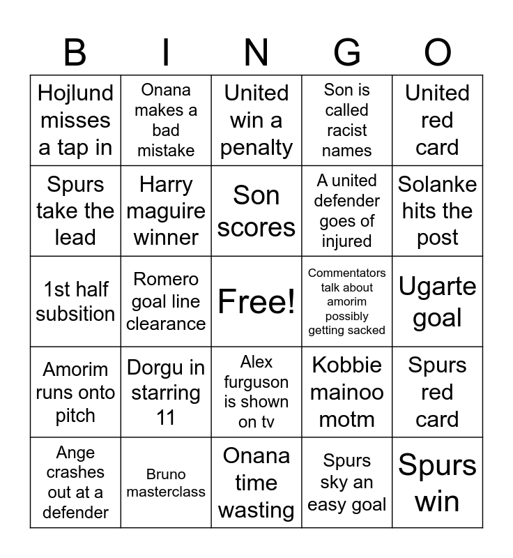 This bingo card has a free space and 24 words: Dorgu in starring 11, Bruno masterclass, Son scores, Ange crashes out at a defender, United red card, Hojlund misses a tap in, Spurs take the lead, Onana makes a bad mistake, Commentators talk about amorim possibly getting sacked, Alex furguson is shown on tv, A united defender goes of injured, 1st half subsition, Kobbie mainoo motm, Spurs red card, Harry maguire winner, Spurs sky an easy goal, Ugarte goal, United win a penalty, Solanke hits the post, Romero goal line clearance, Spurs win, Amorim runs onto pitch, Son is called racist names and Onana time wasting.