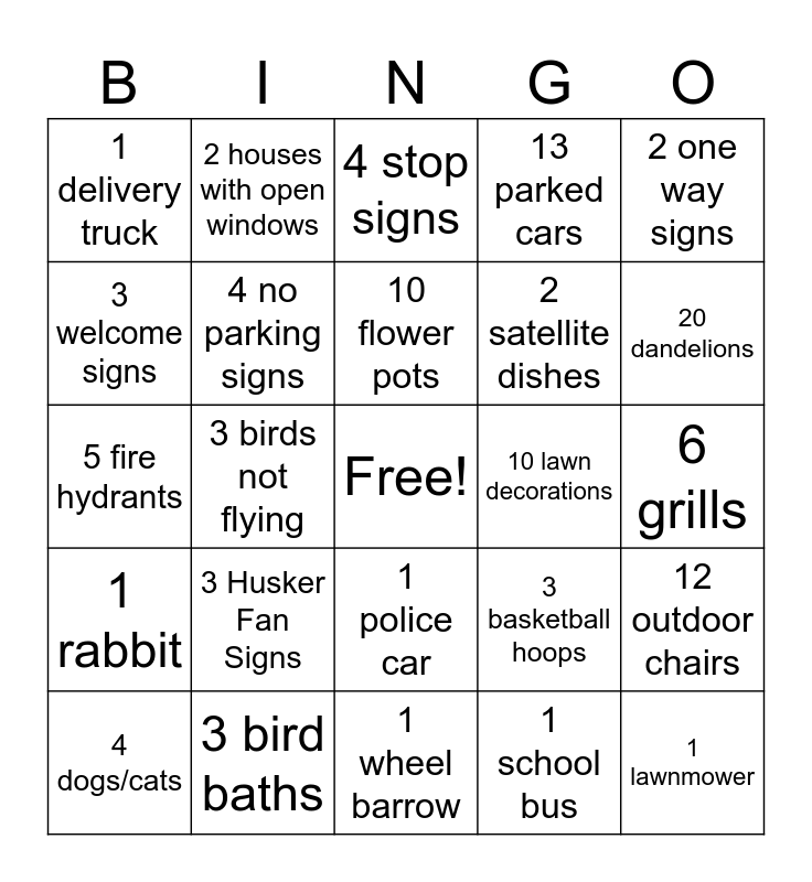 This bingo card has a free space and 34 words: 2 flags, 1 school bus, 1 trampoline, 2 benches, 1 rabbit, 4 no parking signs, 2 one way signs, 4 dogs/cats, 2 houses with open windows, 2 squirrels, 10 flower pots, 4 stop signs, 1 airplane, 5 birds flying, 10 lawn decorations, 20 dandelions, 3 bird baths, 5 fire hydrants, 3 Husker Fan Signs, 3 basketball hoops, 1 police car, 15 trash cans, 1 delivery truck, 6 grills, 1 wheel barrow, 1 lawnmower, 13 parked cars, 3 yellow signs, 2 satellite dishes, 3 welcome signs, 1 blue door, 3 birds not flying, 12 outdoor chairs and 2 open garage doors.