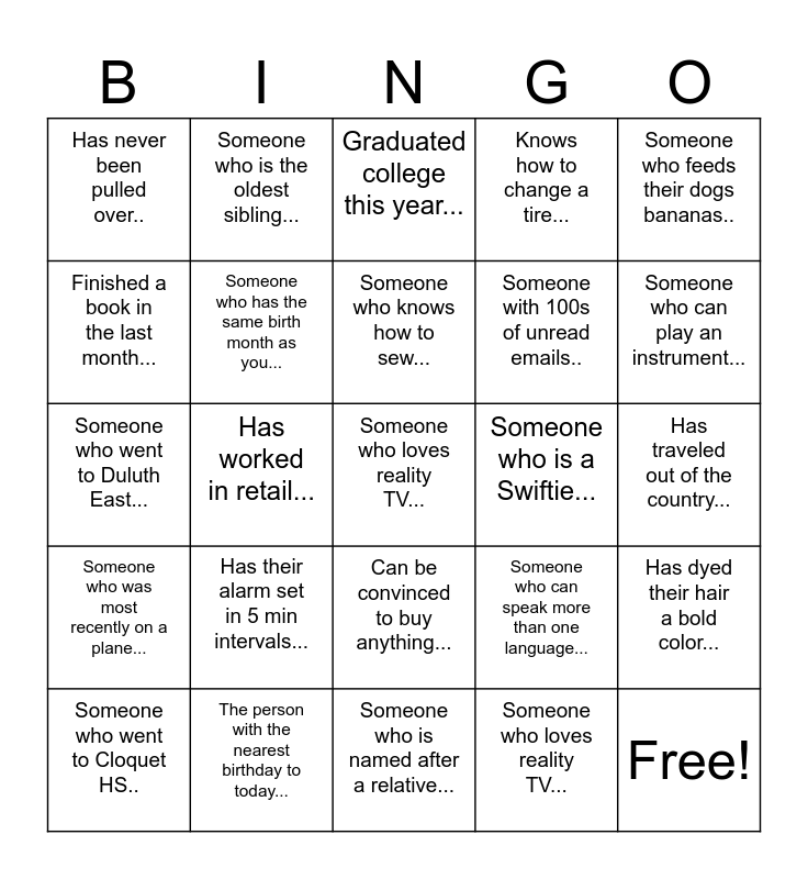 This bingo card has 59 words: Someone who is NOT a morning person..., Has their alarm set in 5 min intervals..., Someone who enjoys Fishing..., Someone who loves reality TV..., Has traveled out of the country..., Someone who has been pulled over recently..., Someone who has the same birth month as you..., Needs music to concentrate..., Knows how to change a tire..., Someone who has a color coded closet..., Finished a book in the last month..., Someone who has a nickname that stuck..., Someone who knows how to sew..., Someone who is left handed..., Someone who was homeschooled..., Has never been pulled over.., Has worked in retail..., Graduated college this year..., Has cried at work..., Someone who can play an instrument..., Someone who was most recently on a plane..., Someone who is the oldest sibling..., Someone who is named after a relative..., Someone who can Parallel Park..., Someone who has over 20,000 photos on their phone..., Someone who would order a peanut butter sundae..., Someone who always has snacks..., Has never broke a bone..., Someone with 100s of unread emails.., Someone who is wearing pink..., Someone who makes their bed every morning..., Someone who gets emotionally attached to TV characters..., Someone who's favorite color is blue..., Someone who has a cracked phone.., Someone who feeds their dogs bananas.., The person with the nearest birthday to today..., Someone who gets their nails done regularly..., Someone who is a Swiftie..., Free!, Someone who went to Duluth East..., Someone who's favorite season is fall..., Someone who loves reality TV..., Someone who can speak more than one language..., Someone who is wearing a necklace..., Has more than 1 Job..., Someone who has their pet as their phone background..., Someone who has a horse..., Someone who is a morning person..., Can be convinced to buy anything..., Has been on a float in a parade..., Someone who was in dance..., Someone who watches the bachelor..., Someone who graduated with less than 70 people..., Listens to podcasts..., Someone who has over 20,000 photos on their phone..., Someone who went to Cloquet HS.., Has ordered off of Tiktok shop..., Has dyed their hair a bold color... and Someone who has a hidden talent....