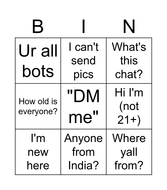This bingo card has a free space and 8 words: Hi I'm (not 21+), What's this chat?, I can't send pics, I'm new here, Ur all bots, Where yall from?, How old is everyone? and Anyone from India?.