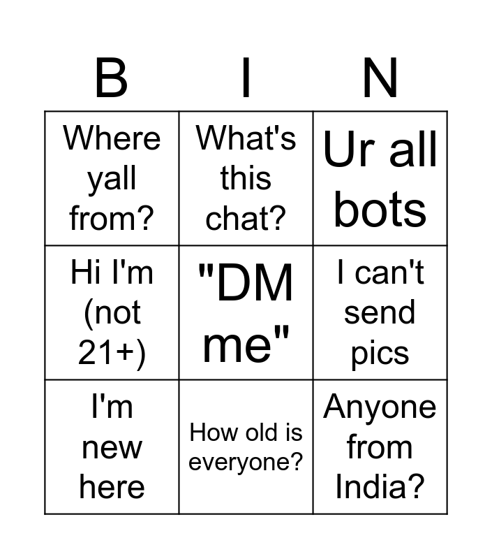 This bingo card has a free space and 8 words: Hi I'm (not 21+), What's this chat?, I can't send pics, I'm new here, Ur all bots, Where yall from?, How old is everyone? and Anyone from India?.