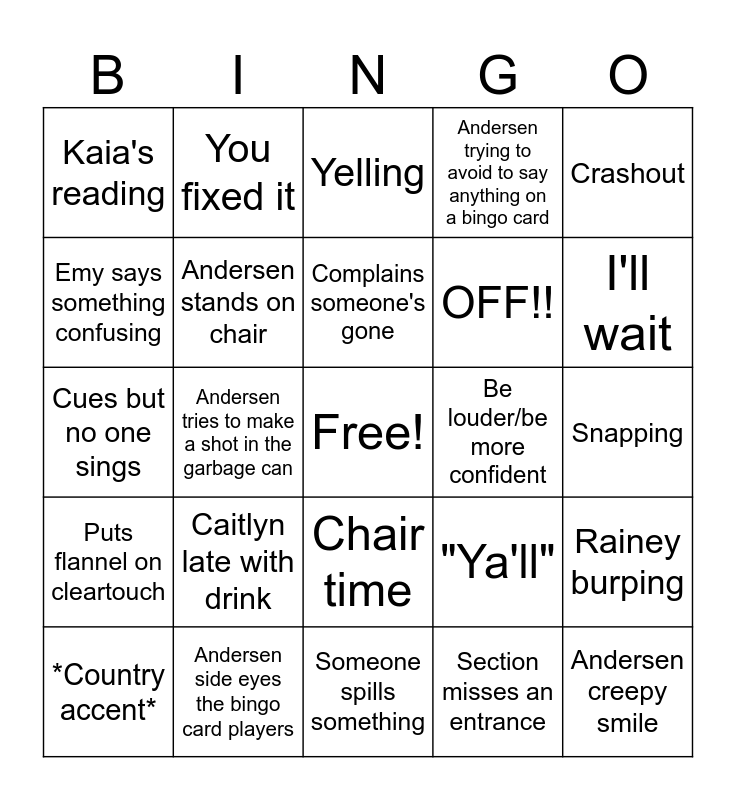 This bingo card has a free space and 28 words: Rainey burping, Get up drink, OFF!!, Section misses an entrance, Emy says something confusing, Yelling, You fixed it, Puts flannel on cleartouch, Be louder/be more confident, *Country accent*, Cues but no one sings, Andersen trying to avoid to say anything on a bingo card, Andersen side eyes the bingo card players, Someone spills something, I'll wait, One more time, Caitlyn late with drink, Andersen stands on chair, Complains someone's gone, Chair time, Kaia's reading, Water bottle falls, Andersen creepy smile, Andersen tries to make a shot in the garbage can, Snapping, "Ya'll", Crashout and Yippeee!.