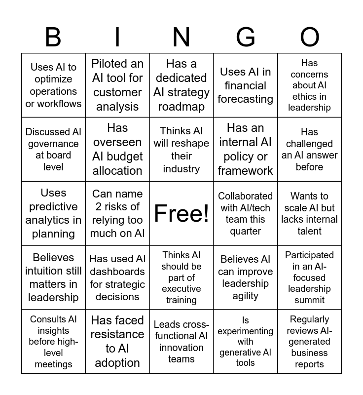 This bingo card has a free space and 24 words: Has used AI dashboards for strategic decisions, Has faced resistance to AI adoption, Thinks AI will reshape their industry, Consults AI insights before high-level meetings, Has concerns about AI ethics in leadership, Uses AI to optimize operations or workflows, Discussed AI governance at board level, Piloted an AI tool for customer analysis, Collaborated with AI/tech team this quarter, Thinks AI should be part of executive training, Has an internal AI policy or framework, Uses predictive analytics in planning, Believes AI can improve leadership agility, Participated in an AI-focused leadership summit, Has overseen AI budget allocation, Is experimenting with generative AI tools, Wants to scale AI but lacks internal talent, Has a dedicated AI strategy roadmap, Has challenged an AI answer before, Can name 2 risks of relying too much on AI, Regularly reviews AI-generated business reports, Believes intuition still matters in leadership, Uses AI in financial forecasting and Leads cross-functional AI innovation teams.