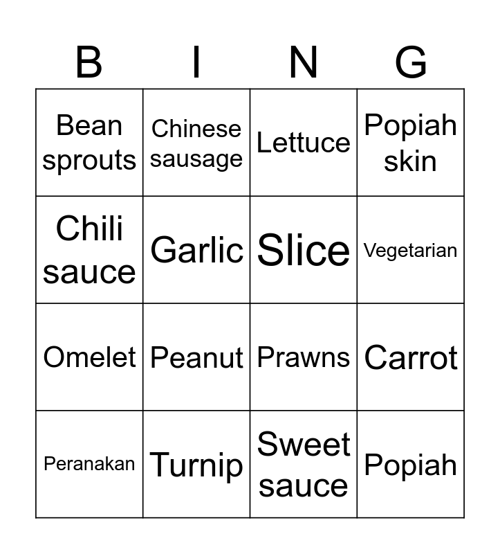 This bingo card has 16 words: Turnip, Carrot, Lettuce, Bean sprouts, Omelet, Chinese sausage, Prawns, Sweet sauce, Chili sauce, Garlic, Peranakan, Popiah skin, Peanut, Vegetarian, Slice and Popiah.