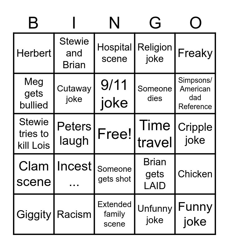 This bingo card has a free space and 24 words: Incest ..., Racism, 9/11 joke, Giggity, Freaky, Herbert, Meg gets bullied, Stewie and Brian, Time travel, Someone gets shot, Someone dies, Stewie tries to kill Lois, Brian gets LAID, Chicken, Cutaway joke, Unfunny joke, Cripple joke, Hospital scene, Simpsons/ American dad Reference, Peters laugh, Funny joke, Clam scene, Religion joke and Extended family scene.