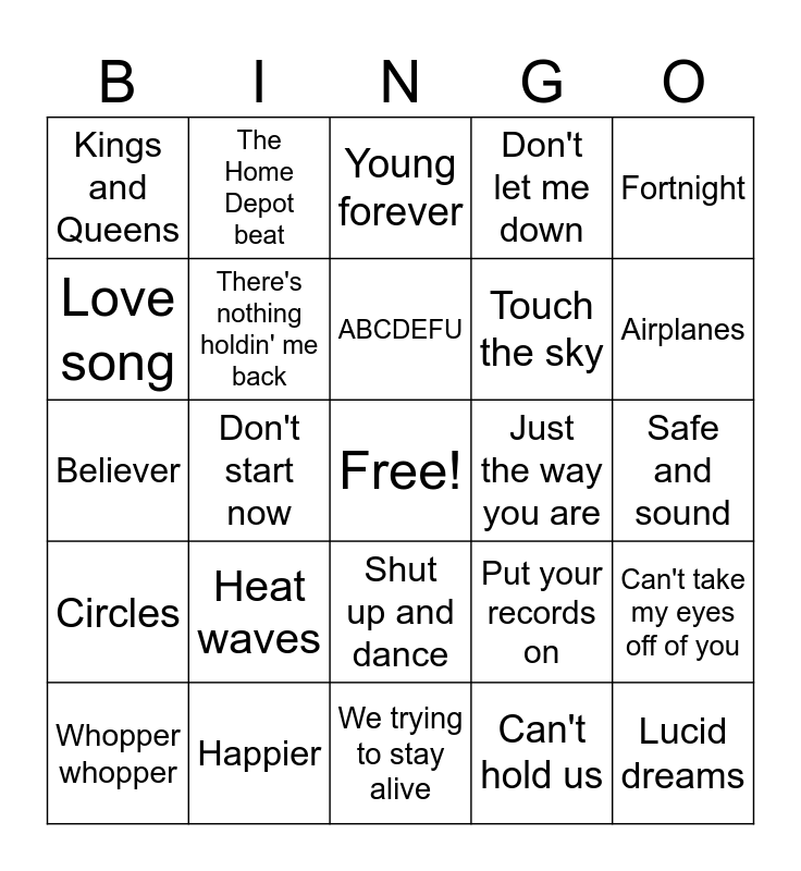 This bingo card has a free space and 41 words: Sunroof, Believer, The nights, There's nothing holdin' me back, Happier, Shut up and dance, ABCDEFU, A sky full of stars, Fortnight, Circles, Don't start now, Don't let me down, Lucid dreams, Safe and sound, Just the way you are, Heat waves, Let me love you, Kings and Queens, Wild ones, Young forever, Can't take my eyes off of you, I can, We trying to stay alive, Touch the sky, Harlem shake, Wrecking ball, Can't hold us, Roar, Airplanes, Taco Bell, Burial, The Home Depot beat, Whopper whopper, Air force ones, Put your records on, Love song, Can't stop the feeling, Better when I'm dancing, Stressed out, Low and A thousand miles.