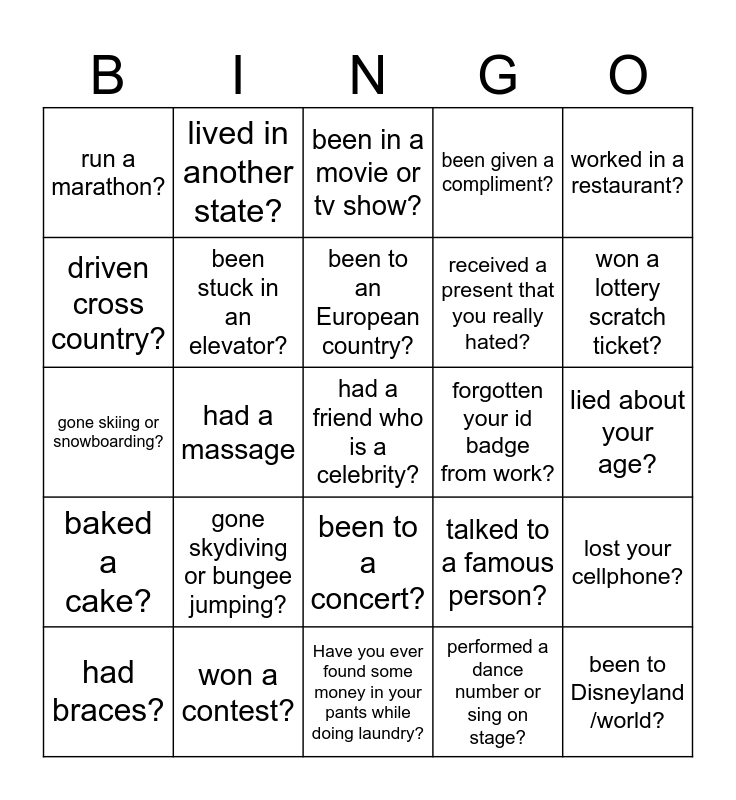 This bingo card has a free space and 24 words: gone skydiving or bungee jumping?, won a contest?, been to an European country?, had braces?, worked in a restaurant?, run a marathon?, driven cross country?, lived in another state?, forgotten your id badge from work?, been to a concert?, received a present that you really hated?, gone skiing or snowboarding?, talked to a famous person?, lost your cellphone?, been stuck in an elevator?, performed a dance number or sing on stage?, lied about your age?, been in a movie or tv show?, won a lottery scratch ticket?, had a massage, been to Disneyland /world?, baked a cake?, been given a compliment? and Have you ever found some money in your pants while doing laundry?.