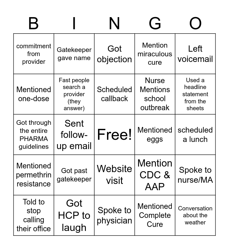 This bingo card has a free space and 24 words: Got past gatekeeper, Got HCP to laugh, Scheduled callback, Told to stop calling their office, Left voicemail, commitment from provider, Mentioned one-dose, Gatekeeper gave name, Mentioned eggs, Website visit, Nurse Mentions school outbreak, Got through the entire PHARMA guidelines, Mention CDC & AAP, Spoke to nurse/MA, Fast people search a provider (they answer), Mentioned Complete Cure, scheduled a lunch, Got objection, Used a headline statement from the sheets, Sent follow-up email, Conversation about the weather, Mentioned permethrin resistance, Mention miraculous cure and Spoke to physician.