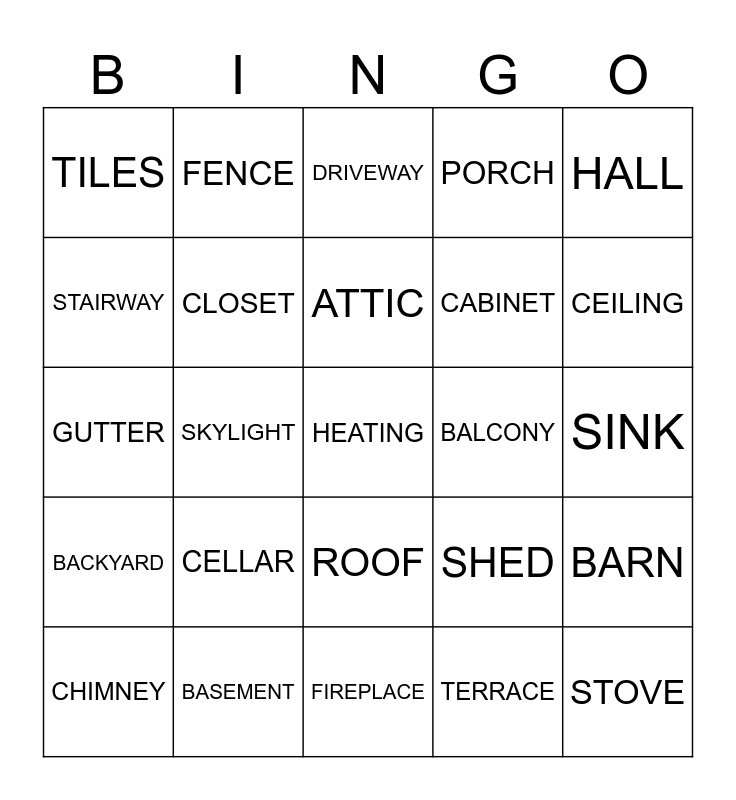 This bingo card has a free space and 24 words: CHIMNEY, CELLAR, ATTIC, TERRACE, HALL, TILES, FENCE, DRIVEWAY, BALCONY, SINK, GUTTER, CLOSET, SHED, BARN, STAIRWAY, BASEMENT, FIREPLACE, PORCH, CEILING, BACKYARD, SKYLIGHT, ROOF, CABINET and STOVE.