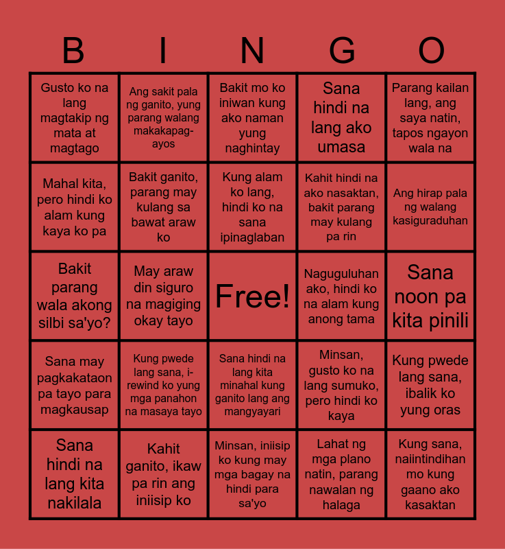 This bingo card has a free space and 30 words: Sana hindi na lang kita nakilala, Minsan, iniisip ko kung may mali ba sa'kin, Ang hirap pala ng walang kasiguraduhan, Bakit ba laging ganito, puro tanong, Sana hindi na lang ako umasa, Gusto ko na lang magtakip ng mata at magtago, Bakit mo ko iniwan kung ako naman yung naghintay, Kung pwede lang sana, ibalik ko yung oras, May araw din siguro na magiging okay tayo, Lahat ng mga plano natin, parang nawalan ng halaga, Sana may pagkakataon pa tayo para magkausap, Kung alam ko lang, hindi ko na sana ipinaglaban, Masakit, pero mas masakit ang mawalan ng pag-asa, Kahit ganito, ikaw pa rin ang iniisip ko, Minsan, gusto ko na lang sumuko, pero hindi ko kaya, Sana kung may pagkakataon lang, sana naging tayo, Minsan, iniisip ko kung may mga bagay na hindi para sa'yo, Sana noon pa kita pinili, Kung pwede lang sana, i-rewind ko yung mga panahon na masaya tayo, Kahit hindi na ako nasaktan, bakit parang may kulang pa rin, Bakit parang wala akong silbi sa'yo?, Yung mga alaala natin, parang pilit na tinatanggal sa isip ko, Parang kailan lang, ang saya natin, tapos ngayon wala na, Bakit ganito, parang may kulang sa bawat araw ko, Naguguluhan ako, hindi ko na alam kung anong tama, Mahal kita, pero hindi ko alam kung kaya ko pa, Sana hindi na lang kita minahal kung ganito lang ang mangyayari, Kung sana, naiintindihan mo kung gaano ako kasaktan, Ang sakit pala ng ganito, yung parang walang makakapag-ayos and Bakit ba ganito? Hanggang kailan ba ako maghihintay?.