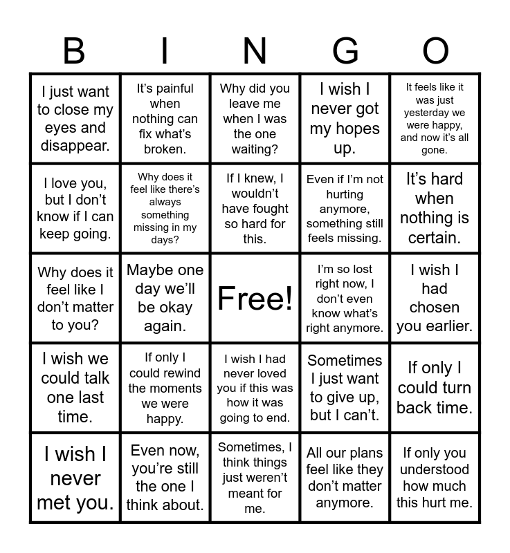 This bingo card has a free space and 30 words: I wish I never met you., Sometimes, I wonder if something is wrong with me., It’s hard when nothing is certain., Why is everything always filled with questions?, I wish I never got my hopes up., I just want to close my eyes and disappear., Why did you leave me when I was the one waiting?, If only I could turn back time., Maybe one day we’ll be okay again., All our plans feel like they don’t matter anymore., I wish we could talk one last time., If I knew, I wouldn’t have fought so hard for this., It hurts, but it hurts even more to lose hope., Even now, you’re still the one I think about., Sometimes I just want to give up, but I can’t., If only there had been a chance for us to be together., Sometimes, I think things just weren’t meant for me., I wish I had chosen you earlier., If only I could rewind the moments we were happy., Even if I’m not hurting anymore, something still feels missing., Why does it feel like I don’t matter to you?, The memories we had are like a constant struggle to forget., It feels like it was just yesterday we were happy, and now it’s all gone., Why does it feel like there’s always something missing in my days?, I’m so lost right now, I don’t even know what’s right anymore., I love you, but I don’t know if I can keep going., I wish I had never loved you if this was how it was going to end., If only you understood how much this hurt me., It’s painful when nothing can fix what’s broken. and How much longer do I have to wait for something that feels impossible?.
