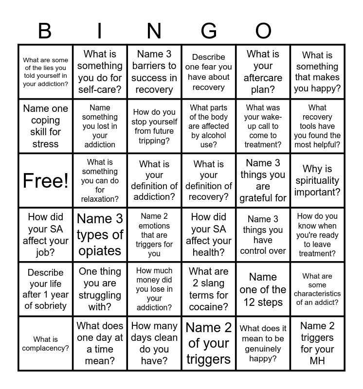 This bingo card has 36 words: What are 2 slang terms for cocaine?, How much money did you lose in your addiction?, Name 2 of your triggers, Name one coping skill for stress, How did your SA affect your job?, What is your definition of recovery?, Name something you lost in your addiction, How many days clean do you have?, What is your aftercare plan?, Name one of the 12 steps, What recovery tools have you found the most helpful?, Describe one fear you have about recovery, What are some characteristics of an addict?, What is something you can do for relaxation?, What parts of the body are affected by alcohol use?, What are some of the lies you told yourself in your addiction?, Describe your life after 1 year of sobriety, Name 3 things you are grateful for, Free!, Name 3 barriers to success in recovery, What is your definition of addiction?, Name 3 types of opiates, How did your SA affect your health?, Name 2 emotions that are triggers for you, Name 3 things you have control over, What is something you do for self-care?, What was your wake-up call to come to treatment?, What does one day at a time mean?, How do you stop yourself from future tripping?, What is something that makes you happy?, Name 2 triggers for your MH, What is complacency?, How do you know when you're ready to leave treatment?, Why is spirituality important?, One thing you are struggling with? and What does it mean to be genuinely happy?.