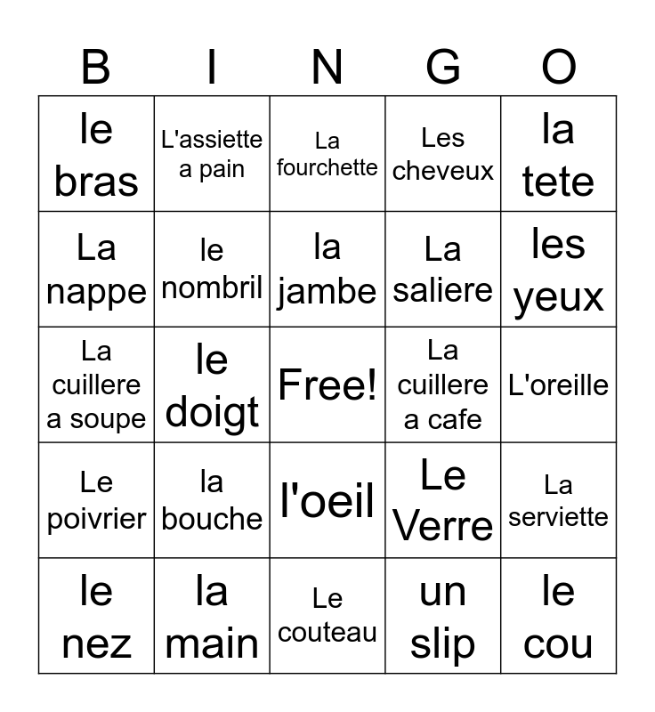 This bingo card has a free space and 27 words: Le Verre, L'assiette, La saliere, Le couteau, La nappe, La fourchette, L'assiette a pain, Le poivrier, La cuillere a cafe, La serviette, La cuillere a soupe, Les cheveux, le nez, la main, les yeux, le pied, le nombril, la jambe, la bouche, le bras, L'oreille, un slip, le doigt, le cou, l'oeil, la tete and l;estomac.