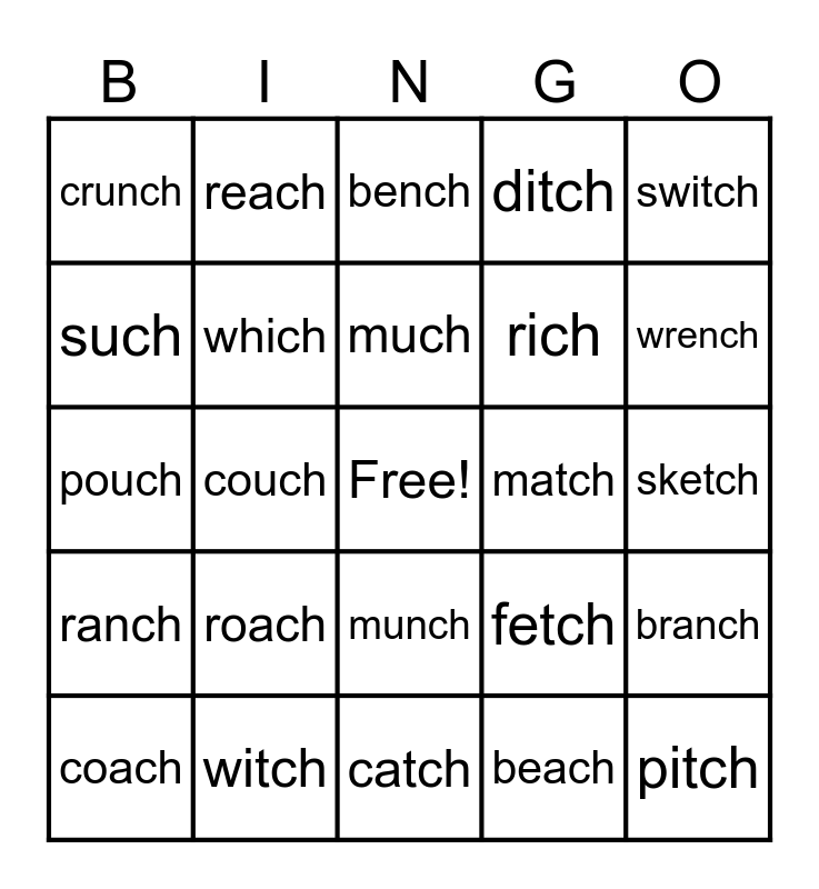 This bingo card has a free space and 24 words: roach, witch, much, coach, switch, crunch, such, reach, match, munch, rich, pouch, fetch, branch, which, beach, sketch, bench, wrench, couch, pitch, ranch, ditch and catch.