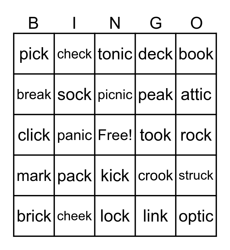 This bingo card has a free space and 24 words: pack, cheek, picnic, brick, book, pick, break, check, took, kick, peak, click, crook, struck, sock, link, rock, tonic, attic, panic, optic, mark, deck and lock.